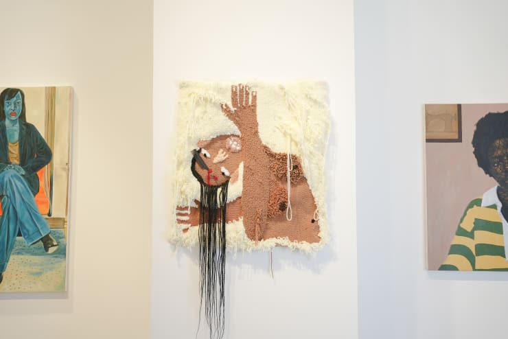 The Welsh-Ghanaian artist Anya Paintsil (born in 1993 in Wales, United Kingdom) addresses similar subjects from the perspective of Black women, primarily working with textiles. Her preferred medium is rug and tapestry, skills passed down intergenerationally from women to women in her family for about 100 years. Paintsil uses this medium as a tool linked to feminist history but also as a celebration of women's craftsmanship throughout time. The profound meaning in Paintsil's practice lies in the use of various materials: with synthetic braided hair and sometimes her own hair, the artist represents Black women with traditional hairstyles, a way to revalorize Afro hair—a contentious subject that has long been and still is considered unprofessional by European standards. Working solely with punch needles and no electric tools, the artist presents the medium as a tool of the working class, as opposed to embroidery, once associated with the upper class. The handmade works reflect the care demanded by Afro hair. Paintsil's practice is intuitive and addresses the memories and traumas of her experience as a Black woman born in Wales (United Kingdom).